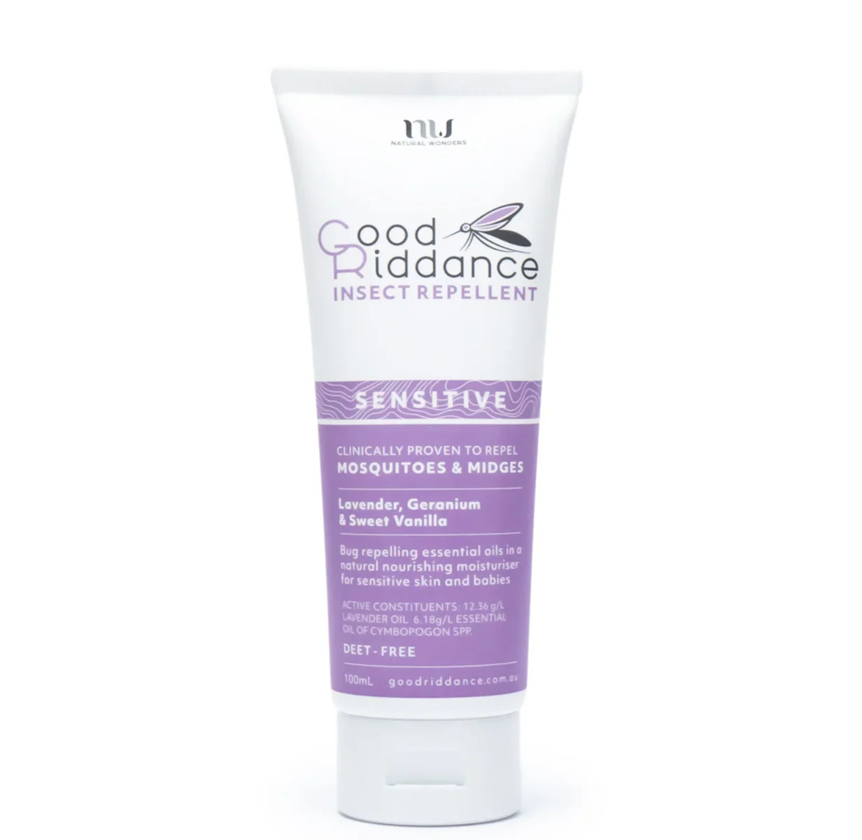 Good Riddance Sensitive Insect Repellent is the only insect repellent in Australia suitable for babies over 3 months, during pregnancy and for use on sensitive skin or eczema. It provides clinically proven long lasting natural protection against mosquitoes, midges and sandflies that can carry harmful viruses such as Ross River and Dengue.